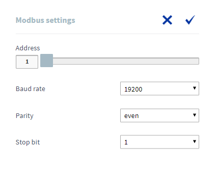 - Indtast ventilationsenhedens Modbus-adresse i feltet Adresse . Alternativt kan adressen indstilles ved hjælp af den blå skyder. Adressen kan indstilles mellem 1 og 247.