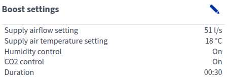 - Indstilling af tilluftmængde - Indstil den boostede tilluftmængde til ventilation (l/s eller m³/h). Tilstanden Boost bruges i situationer, hvor der midlertidigt er brug for ekstra ventilation, f.eks. til brusebad, madlavning, eller når der er et større antal mennesker indendørs. Indstillingen af tilluftmængden kan ikke være lavere end i tilstanden Hjemme .