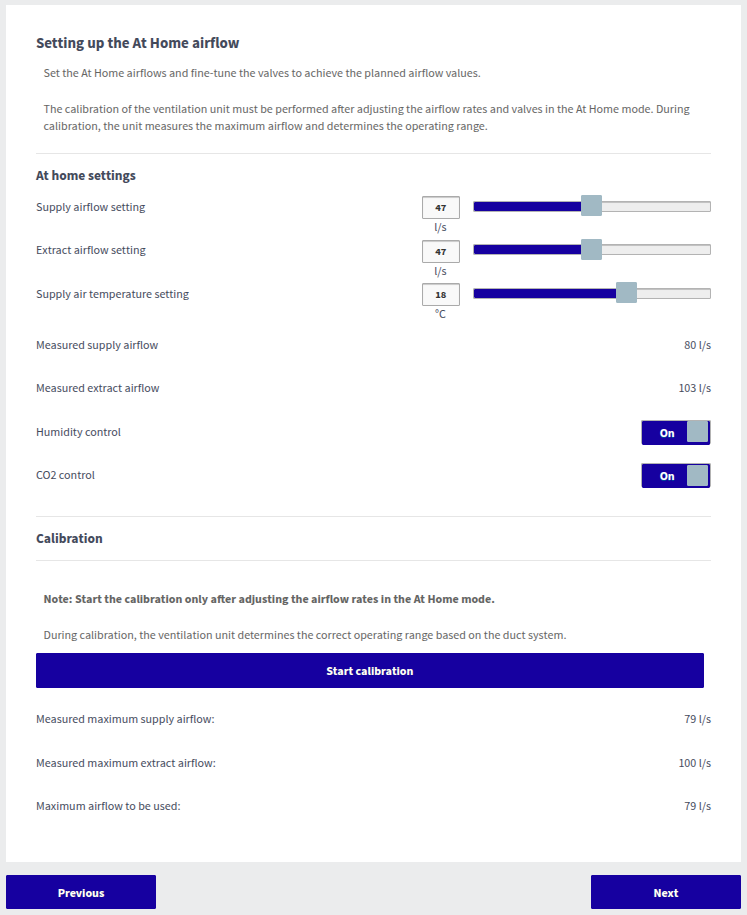 Indstilling af luftstrømme for Hjemme-tilstandIndstil luftmængderne, tillufttemperaturen samt fugt- og CO₂-styring for Hjemme-tilstanden.