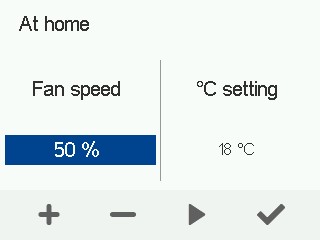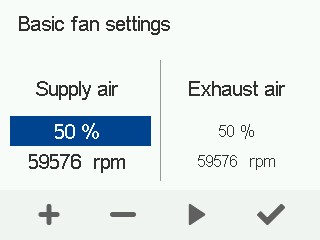 - Juster ventilerne, og indstil tilluft- og fraluftventilatorerne til de kontrolprocenter, der muliggør luftstrømmene i Hjemme-tilstanden.