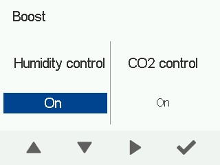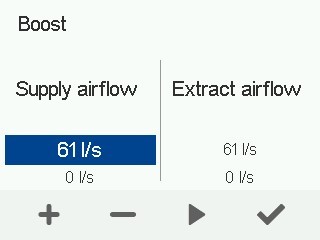 Luftstrømmene i Boost-tilstanden er automatisk 30 % højere end luftstrømmene i Hjemme-tilstanden, men de kan justeres. Andre indstillinger for Boost-tilstand konfigureres identisk med indstillingerne for Hjemme-tilstand. Der kan også indstilles en timer for Boost-tilstanden.