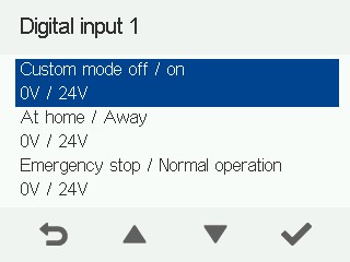 • Nødstop/Normal - Slukker for ventilationsenheden baseret på en ekstern nødstopmeddelelse fra f.eks. en automatiseret understation eller en kontakt. Vælg ikke nødstopfunktionen, hvis den digitale indgang ikke er tilsluttet en spænding på 24 V.