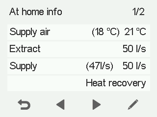 - Tilførsel — Angiver den aktuelle tilluftmængde (l/s eller m³/h). Hvis ventilationsenheden automatisk øger luftstrømmen som reaktion på en øget luftfugtighed eller kuldioxidniveau eller et behov for afkøling, kan den faktiske luftstrøm være højere end den indstillede værdi. Den indstillede værdi vises i parentes.