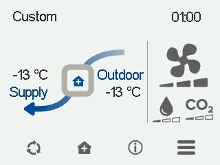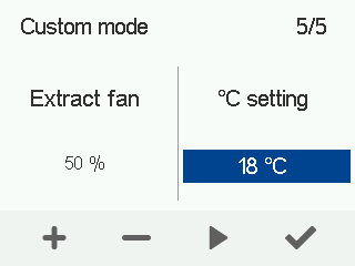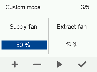 - Brug knapperne Plus og Minus til at indstille tilluftventilatorens udgang som en procentdel af det maksimale udgang for den brugerdefinerede tilstand.TIP: