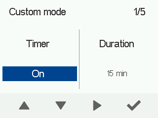 - Brug knapperne Plus og Minus til at indstille varigheden af brugerdefineret tilstand i minutter. Denne værdi angiver varigheden af den brugerdefinerede tilstand, når den brugerdefinerede tilstand er aktiveret. Den anbefalede varighed er 15-30 min.