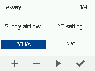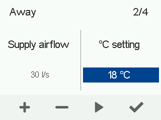 - Brug knapperne Plus og Minus til at indstille den ønskede tillufttemperatur for denne ventilationsindstilling.Temperaturområdet er +5°C - +25°C.