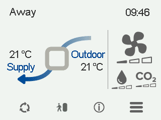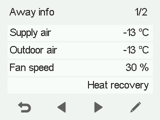 - Tilluft - Angiver den faktiske temperatur på den luft, der strømmer ind i lejligheden, og indstillingen af tillufttemperaturen (i parentes), hvis tilluften er varmere end den indstillede værdi.