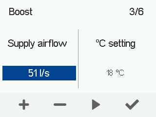 - Brug knapperne Plus og Minus til at indstille timeren i timer og minutter for tilstanden. Denne værdi angiver varigheden af den øgede ventilation, når tilstanden Boost er aktiveret.