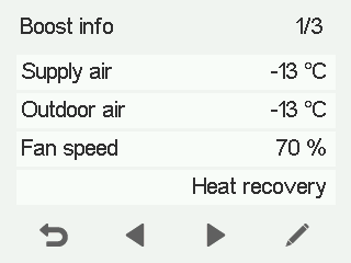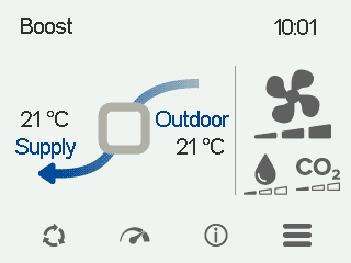 Tilluft - Angiver den faktiske temperatur på den luft, der strømmer ind i lejligheden, og indstillingen af tillufttemperaturen (i parentes), hvis tilluften er varmere end den indstillede værdi.