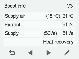 - Tilførsel — Angiver den aktuelle tilluftmængde (l/s eller m³/h). Hvis ventilationsenheden automatisk øger luftstrømmen som reaktion på en øget luftfugtighed eller kuldioxidniveau eller et behov for afkøling, kan den faktiske luftstrøm være højere end den indstillede værdi. Den indstillede værdi vises i parentes.
