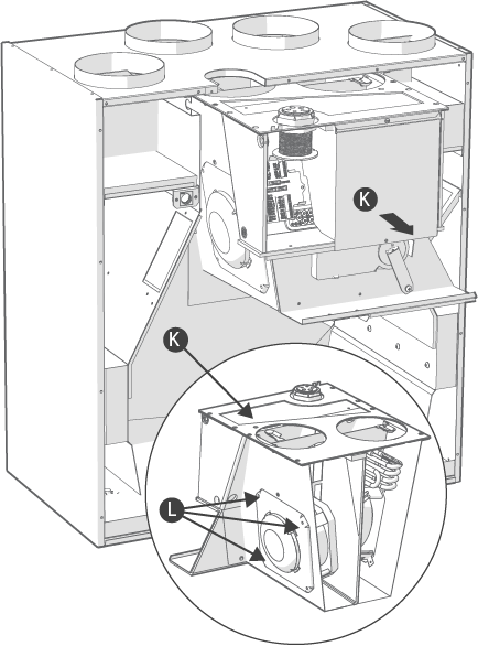- Træk ventilatorkammeret (M) ud af aggregatet (indeholder ventilatorerne, el-skabet og bypass-kanalen inkl. dæmpermotoren).