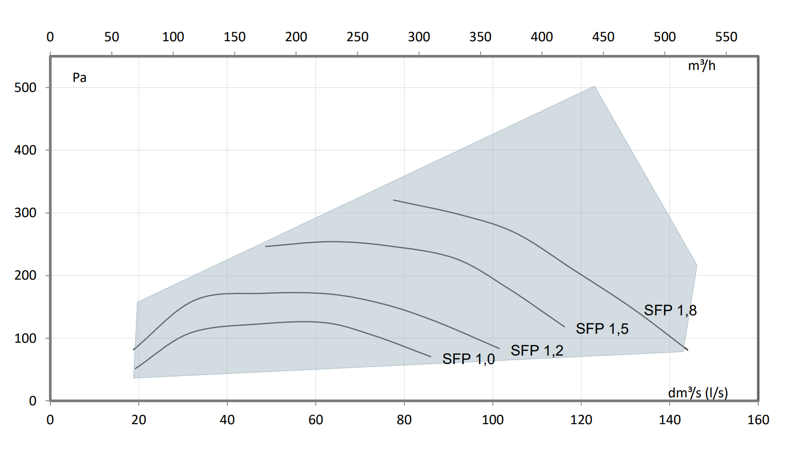 Den anbefalede SFP-værdi (Specific Fan Power) er <1,8 (kW m3/s). Ved et lavere totaltryk er SFP-hastigheden lavere.