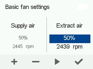 - Use the Plus and Minus buttons to set the extract air fan ratio as a percentage of the maximum output ratio. The fan speed (rpm) will change accordingly.