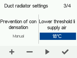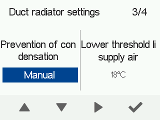 • Automatic — The supply air limit is adjusted automatically according to the extract air dew point. When the supply air temperature drops too low, the duct radiator is switched off.