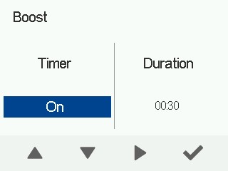 The air flows in the Boost mode are automatically 30% higher than the air flows in the At Home mode, but they can be adjusted. Other Boost mode settings are configured identically to the settings of the At Home mode. A timer can also be set for the Boost mode.