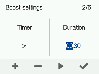- Use the Plus and Minus buttons to set the timer in hours and minutes for the mode. This value indicates the duration of boosted ventilation when the Boost mode is activated.