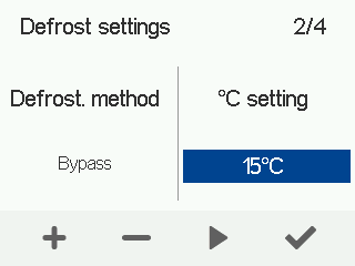 - Set the target supply air temperature during defrosting. The temperature range is +12°C – +20°C. The factory setting is 15°C.