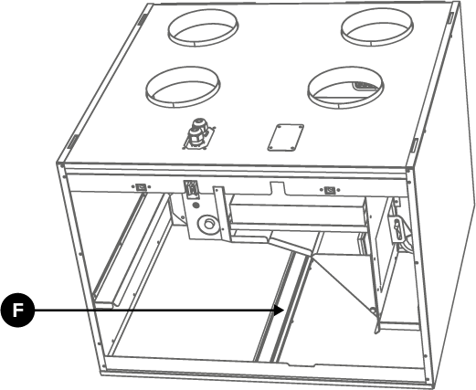 - Ensure that the lower support (F) is in place between the knobs at the bottom of the unit.