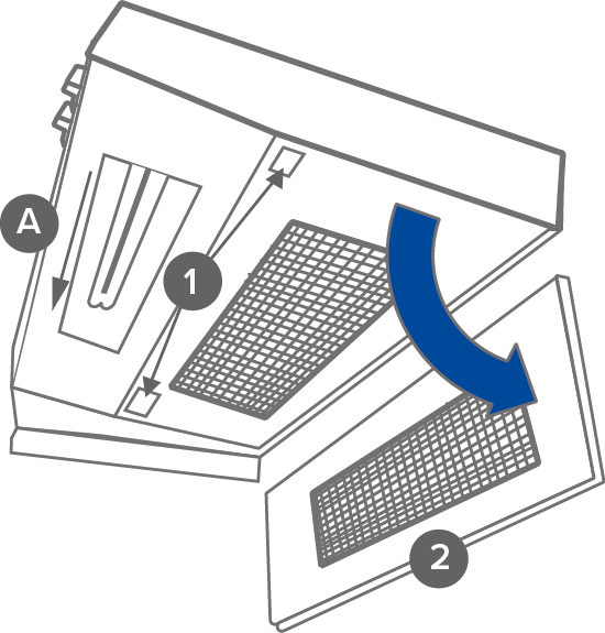 To replace the cooker hood lamp (type PL 11, 11 W), remove the protective glass of the lamp (A) by pushing it to the left. Once you have replaced the lamp, put the protective glass back in its place.