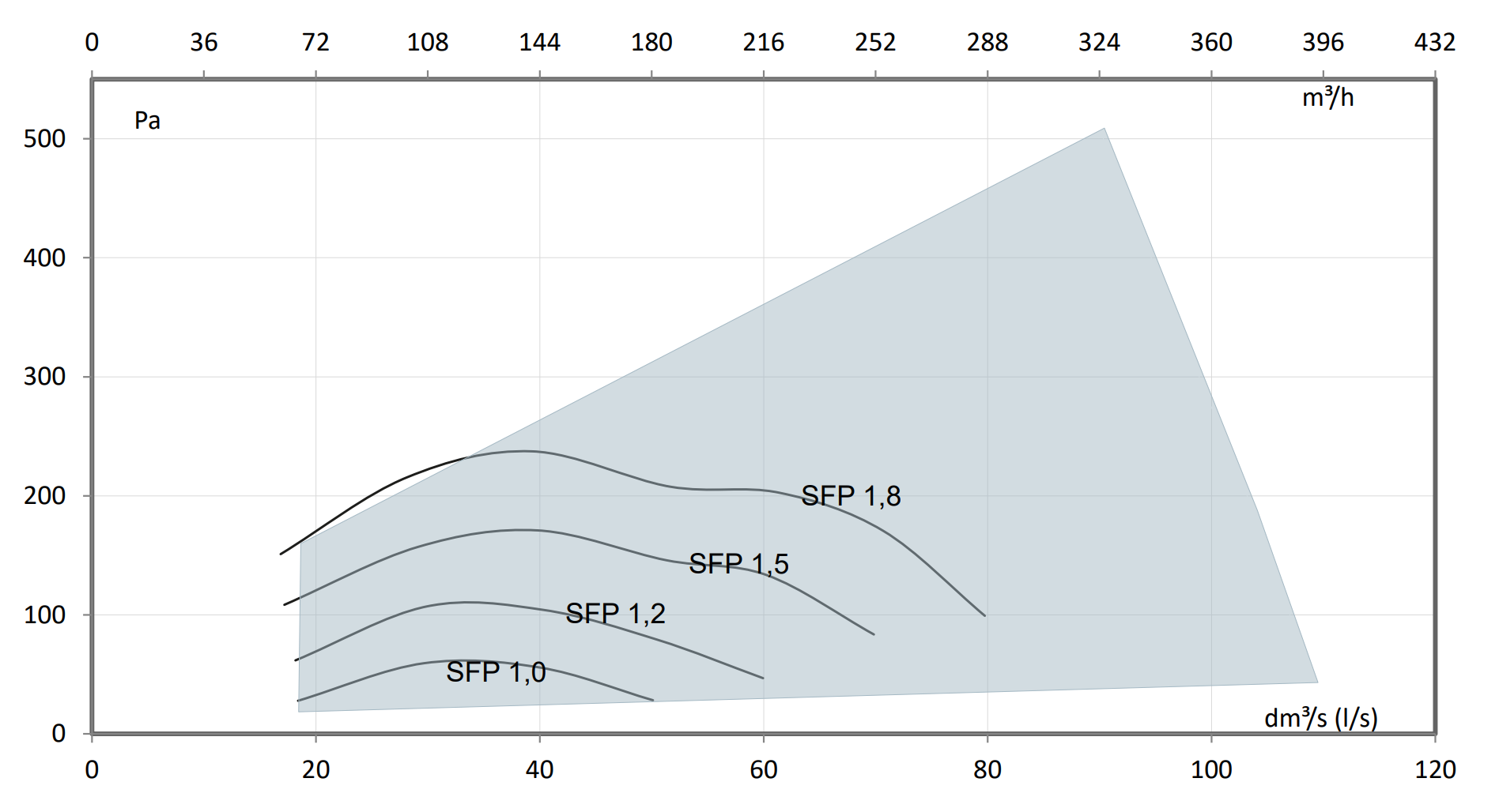 The recommended SFP (Specific Fan Power) rate is <1.8 (kW m3/s). At a lower total pressure, the SFP rate is lower.