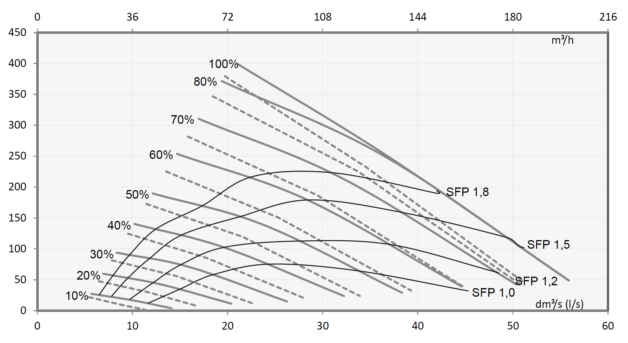 SFP rate (Specific Fan Power) recommended value <1.8 (kW/m3/s). When a lower total pressure is used, also the SFP of the speed is lowered.