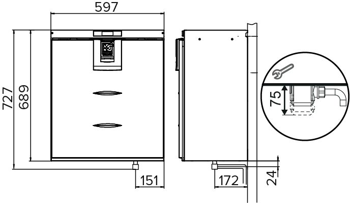 The total height with the condensing water outlet is 727 mm (installation space + 2 mm).