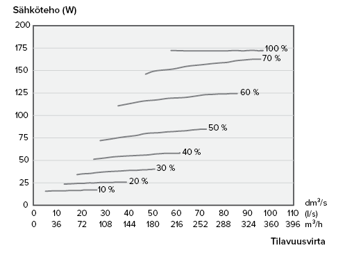Supply/extract air volumes and input powers Figure 1. Supply and extract air volumesContinuous line (—)Extract airBroken line (- -)Supply air SFP = Input power (total) (W) Air flow (max) (dm3/s) SFP rate (Specific Fan Power) recommended value <1.8 (kW/m3/s). Figure 2. Fan input power