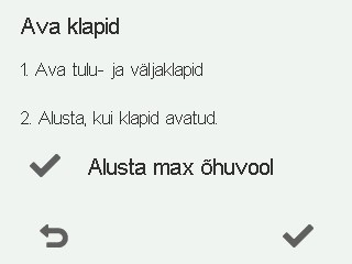 Avage ventiilid. Maksimaalse õhuvoolu testi läbiviimiseks peavad kõik ventiilid/terminaalseadmed olema täielikult avatud.