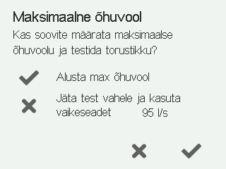 Saate mõõta ventilatsiooniseadme maksimaalset õhuvoolu kasutusel olevas kanalisüsteemis. Test ei kesta kauem kui üks minut ja see ei ole kohustuslik. Testi vahelejätmiseks valige Tühista: . Kui test jäetakse vahele, kasutatakse vaikimisi maksimaalse õhuvoolu väärtust.