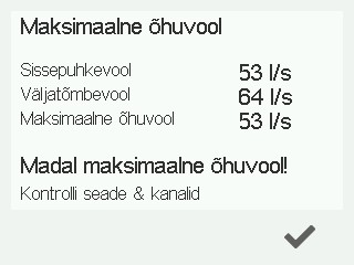 Kui maksimaalne õhuvool on madal, võib sissepuhke- või väljatõmbeõhuvool olla blokeeritud. Sel juhul kontrollige, kas ventilatsiooniseadmes ja kanalites on takistusi.