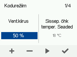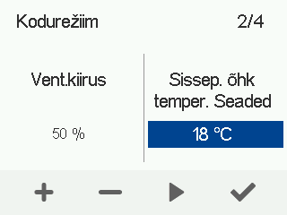 - Kasutage Pluss ja Miinus nuppe, et määrata selle ventilatsiooni režiimi sissepuhkeõhu sihttemperatuur.Saate seadistada temperatuuri vahemikus +5°C kuni +25°C. Soovituslik temperatuur on +18°C või 2–3°C alla toatemperatuuri.