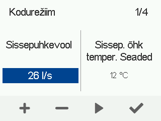 - Kasutage Pluss ja Miinus nuppe, et seadistada sissepuhkeõhu vooluhulga sihttase. Väljatõmbeõhu vooluhulka reguleeritakse automaatselt vastavalt sissepuhkeõhu vooluhulgale ning kasutaja ei pea seda eraldi reguleerima.