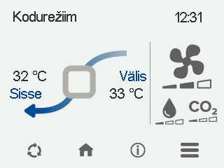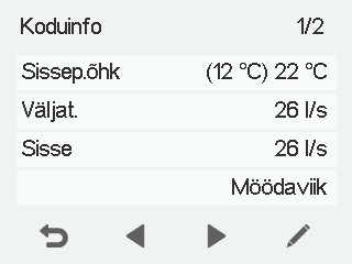 - Sissepuhe — Näitab hetke sissepuhke õhuvoolu (l/s või m³/h). Kui ventilatsiooniseade suurendab automaatselt õhuvoolu suurenenud niiskuse või süsihappegaasi taseme või jahutusvajaduse tõttu, võib tegelik õhuvool olla seadistatud väärtusest suurem. Seadistatud väärtus on näidatud sulgudes.