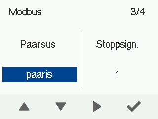 - Kasutage Üles nool ja Alla nool nupud Modbus-i seadistamiseks Paarsus. Valikud on: