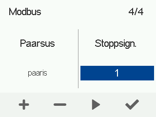 - Kasutage Pluss ja Miinus nupud Modbus-i seadistamiseks Peatus. Valikud on 1 või 2.