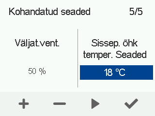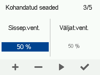 Avaneb ekraan režiimi sissepuhkeõhu ventilaatori võimsuse seadistamiseks: