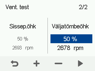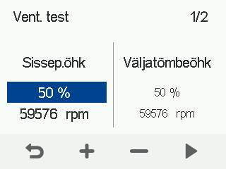 - Kasutage Pluss ja Miinus nupud sissepuhkeõhu mahu seadistamiseks protsendina maksimaalsest võimsusest.Te kuulete, kui ventilaatori kiirus muutub vastavalt seadistatud väärtusele. Ventilaatori pöörlemiskiirus on näidatud p/min väljal.