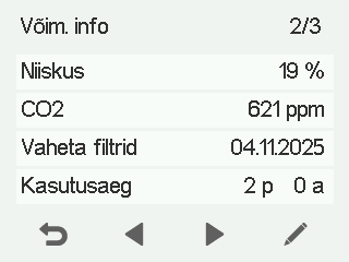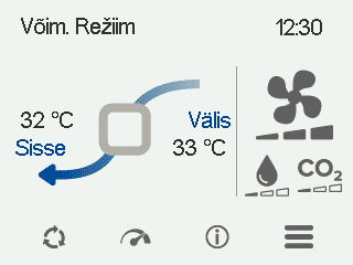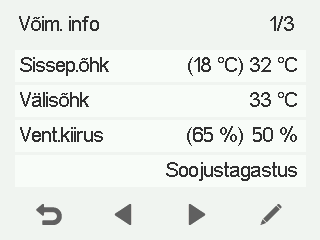 Sissepuhkeõhu — Näitab korterisse voolava õhu tegelikku temperatuuri ja sissepuhkeõhu temperatuuri seadistust (sulgudes), kui sissepuhkeõhk on soojem kui seadistatud väärtus.