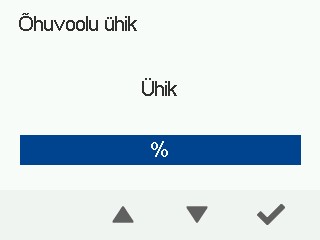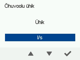 Õhuvoolu ühikÕhuvoolu ühiku valikud on: l/sm3/h%Määrake õhuvoolu ühik.Jätkake seadistamist, valides OK:Kui kasutate %-ühikut (ventilaatori kiiruse %-juhtimine), minge Ventilaatori kiiruse % juhtimine.