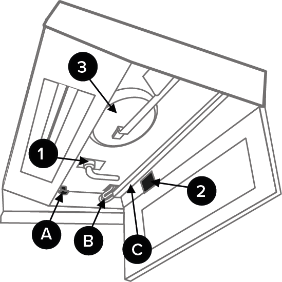 - Nosta liesikupu ilmanvaihtokoneen pohjaa vasten. Pujota samalla liitäntäjohto (B) liesikuvun sisään.