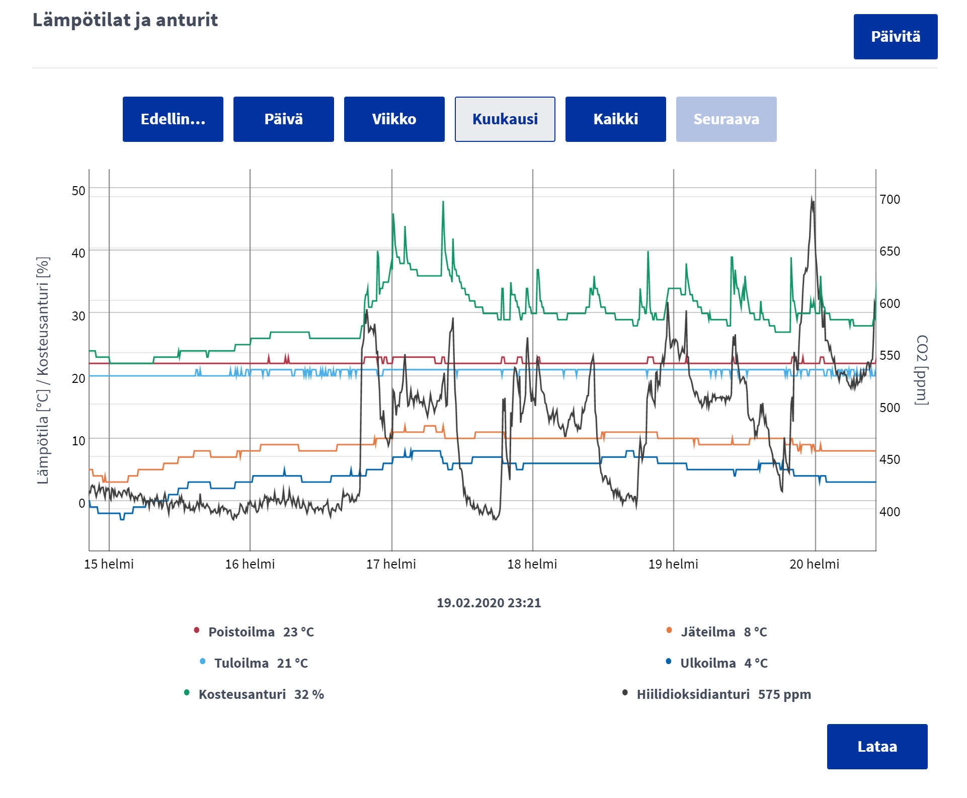 Voit valita haluamasi tarkasteluajanjakson kuvaajan yläpuolella olevilla painikkeilla.