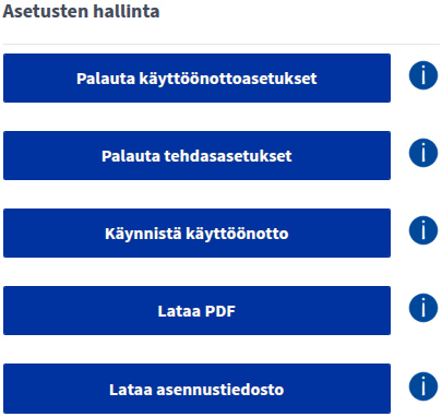 - Palauta tehdasasetukset — Palauttaa ilmanvaihtokoneen alkuperäiset asetukset. Kaikki käyttäjän tekemät muutokset poistetaan.