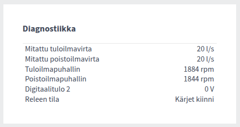 Diagnostiikka-näytöllä voit seurata ilmanvaihtokoneen reaaliaikaisia arvoja, kuten ilmavirtoja, puhaltimien nopeuksia ja digitaalitulojen sekä releen tilaa.