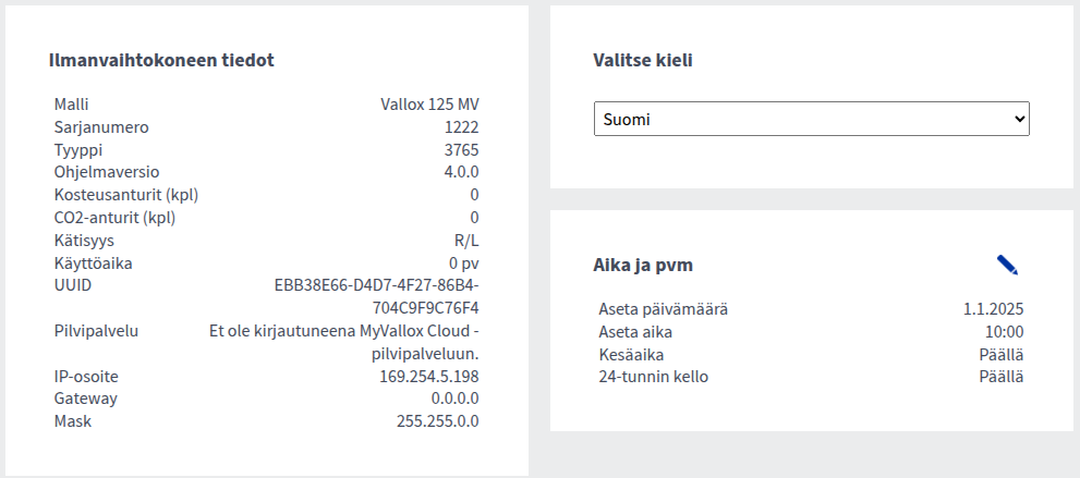 • MyVallox Cloud UUID — Ilmanvaihtokoneen yksilöllinen tunniste MyVallox Cloud -pilvipalvelussa.