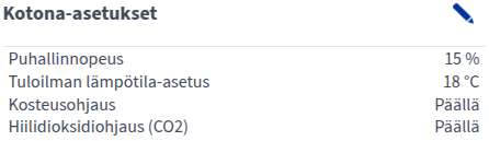 - Puhallinnopeus — Aseta ilmanvaihdon voimakkuus normaalikäyttöön väliltä 0-100%. Puhallinnopeus vaikuttaa ilmanvaihdon tehoon ja sitä kautta sisäilman laatuun. Puhallinnopeus ei saa olla pienempi kuin Poissa-tilassa eikä suurempi kuin Tehostus-tilassa.