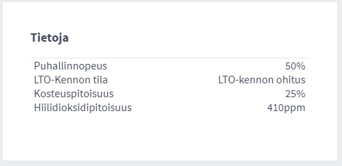 - Puhallinnopeus — Näyttää ilmanvaihtokoneelle asetetun puhallinnopeuden. Jos automaattinen tehostus (esim. kosteus- tai hiilidioksidiohjaus) on käytössä, todellinen puhallinnopeus voi poiketa asetetusta. Todellinen nopeus näkyy erikseen Tietoja-alueella.