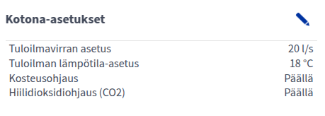 - Puhallinnopeus — Näyttää ilmanvaihtokoneelle asetetun tuloilmavirta-asetuksen (l/s tai m3/h). Jos automaattinen tehostus (esim. kosteus- tai hiilidioksidiohjaus) on käytössä, todellinen ilmavirta voi poiketa asetetusta. Todellinen tuloilmavirta ja poistoilmavirta näkyvät erikseen Tietoja-alueella.