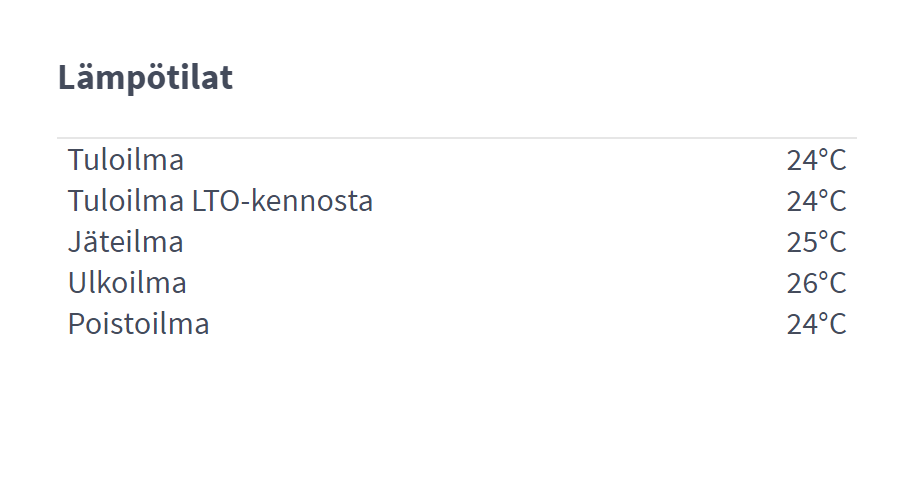 Lämpötilat -alue näyttää ilmanvaihtokoneen lämpötila-antureiden lukemat: