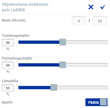 - Aseta ohjelmoitavan sisääntulon tuloilmapuhaltimen teho prosentteina