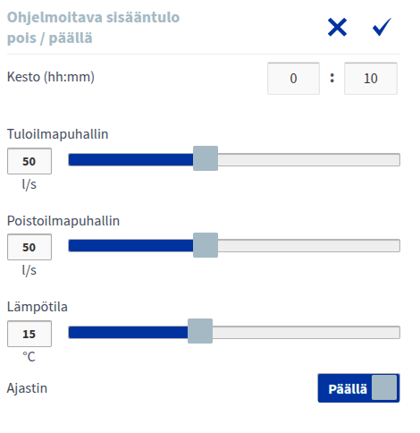 Aseta ohjelmoitavan sisääntulon tulopuhaltimen ja poistoilma puhaltimen ilmavirrat (l/s tai m3/h). Huomioi, että kompensaatiotilanteissa tulo- ja poistoilmavirtojen eron ei suositella olevan yli 30 %.
